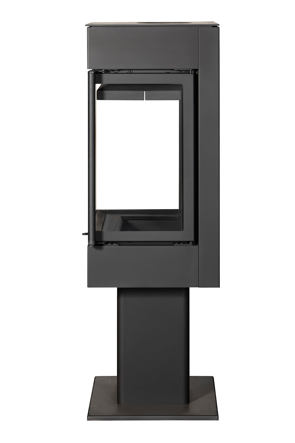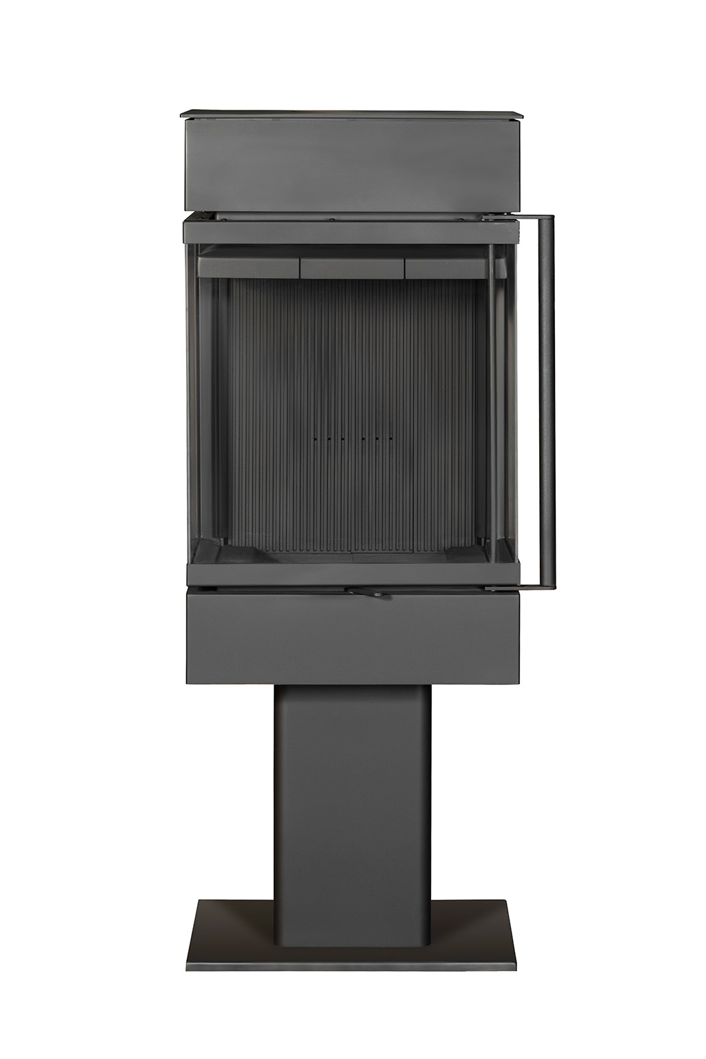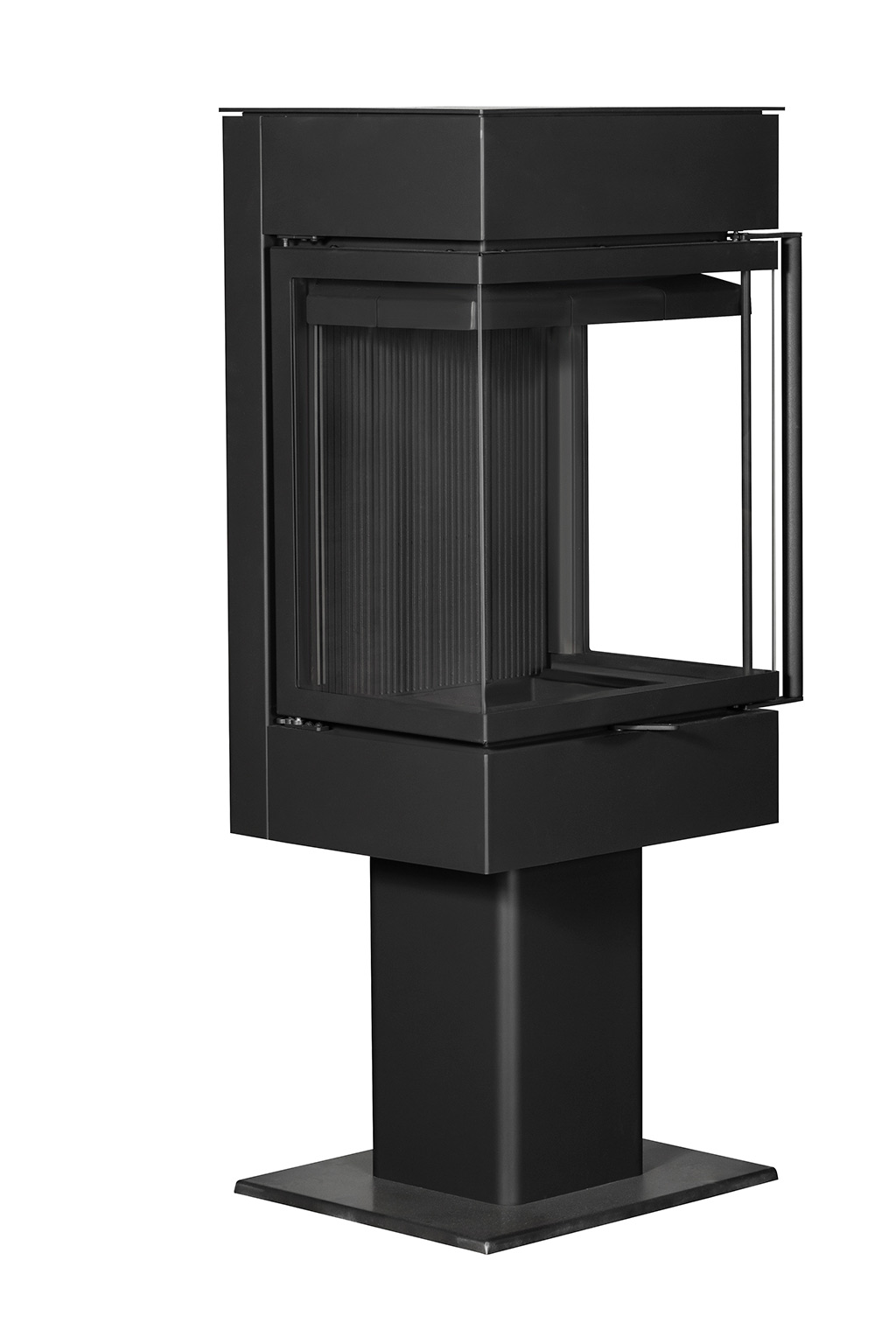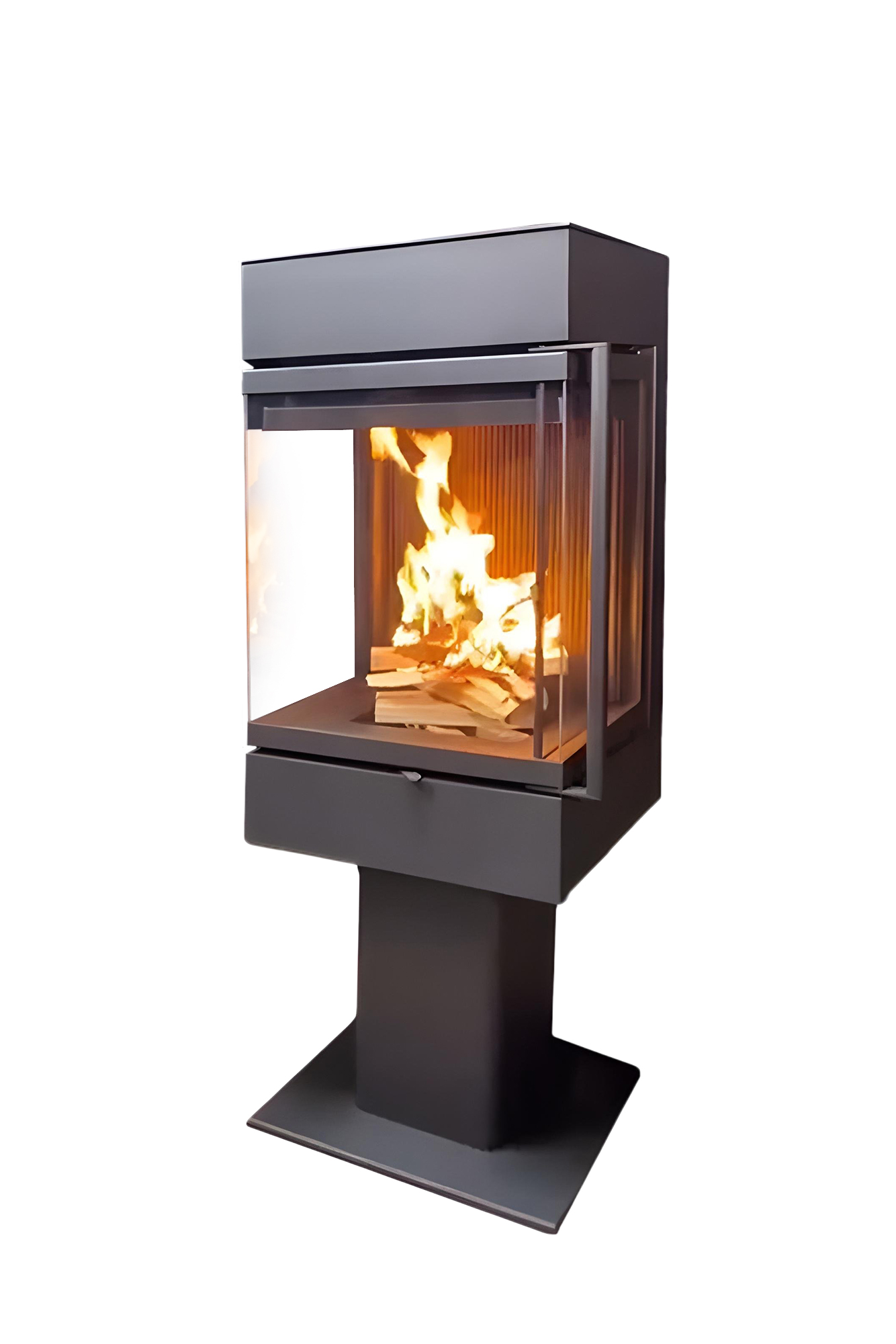 Инновационный камин с панорамным обзором огня, высоким стеклом и чугунной футеровкой.